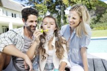 Front view of a Caucasian woman enjoying family time with her daughter at home together, brushing their teeth and smiling in a bathroom — Stock photos