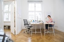 Jeune femme concentrée utilisant un téléphone portable et assise à table avec des moniteurs au bureau — Photos de stock