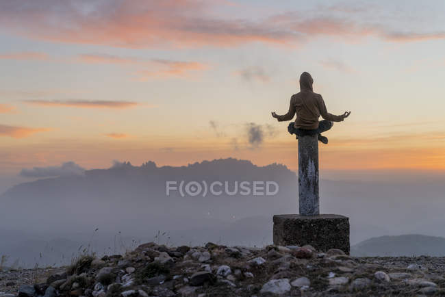 Vue arrière de deux femmes regardant le coucher du soleil sur les montagnes — Photo de stock