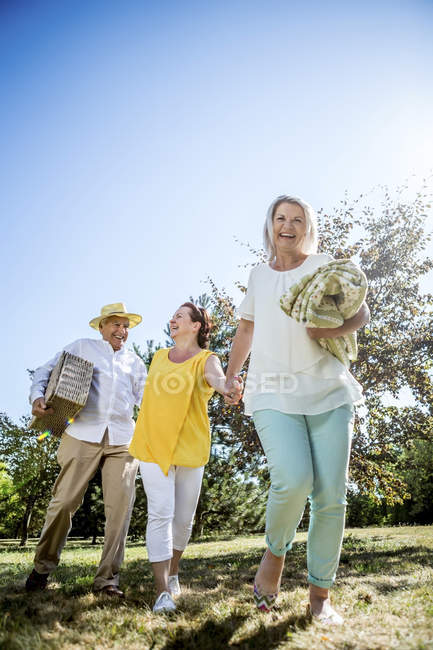 Vecchia coppia a piedi in un prato — Foto stock