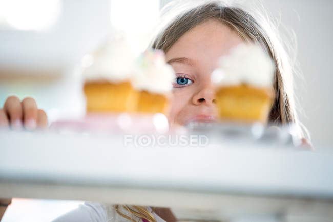 Ragazza prescolare mangiare ciambelle su sfondo bianco . — Foto stock