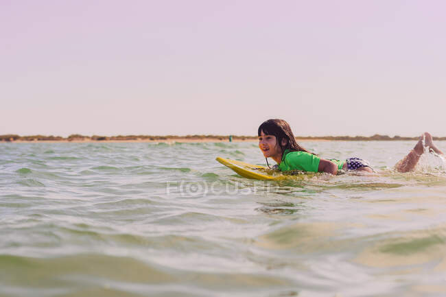Vista laterale del viso sopra la superficie dell'acqua di riposo donna tranquilla con gli occhi chiusi in piscina nella soleggiata giornata estiva — Foto stock