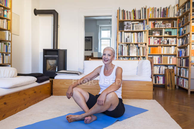 Dall'alto del raccolto femminile concentrato in abbigliamento sportivo seduto con le gambe incrociate e gli occhi chiusi sul tappetino yoga a casa