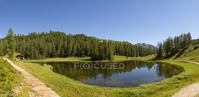 Paesaggio mozzafiato con montagne e rocce nei campi e strada per escursioni durante una giornata di sole con cielo azzurro chiaro — Foto stock