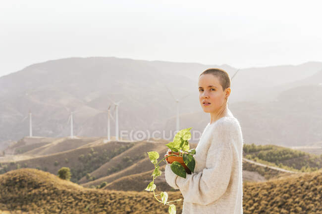 Engenheira feminina usando walkie-talkie em usina de energia alternativa — Fotografia de Stock