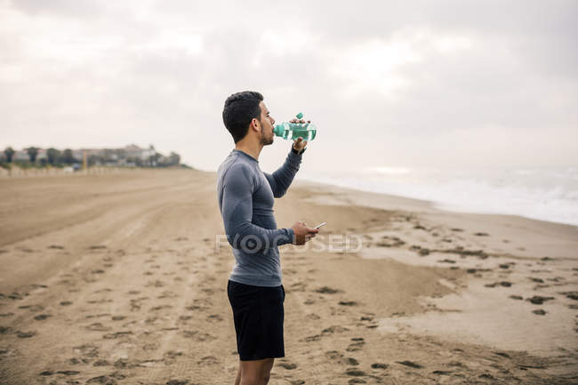 Jogadora de voleibol feminina tira foto com celular na praia — Fotografia de Stock