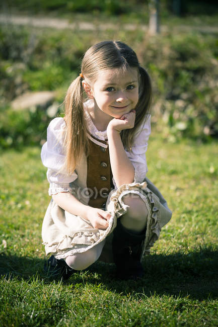 Мечтательная молодая женщина в винтажном платье, задумчиво глядя в сторону, стоя в одиночестве в темном травянистом поле против облачного закатного неба в сумерках — стоковое фото