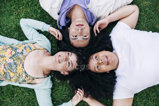 Неузнаваемый парень, использующий смартфон, чтобы сфотографировать двух милых женщин, проводя время на природе вместе — стоковое фото