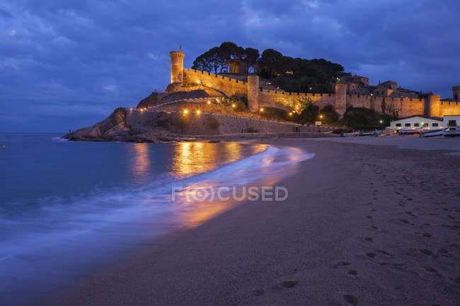 Извилистая горная дорога, пересекающая каменный мост и ведущая вдоль скалистого побережья Испании в сумерках — стоковое фото