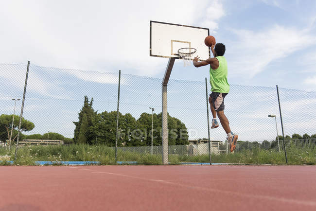 Анонимный спортсмен в спортивной одежде, стоящий на площадке с желтым мячом и баскетбольным кольцом во время игры на улице