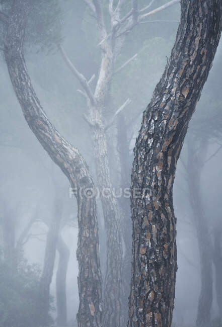 Vista panorámica de Pedriza con niebla que se difunde entre la cordillera de Guadarrama y rocas con coníferas al amanecer en España - foto de stock