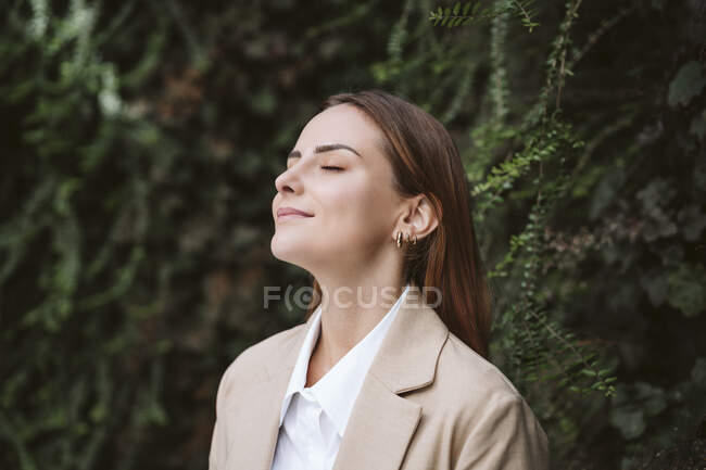 Mujer joven bailando en la calle con auriculares mientras mueve su cabello - foto de stock