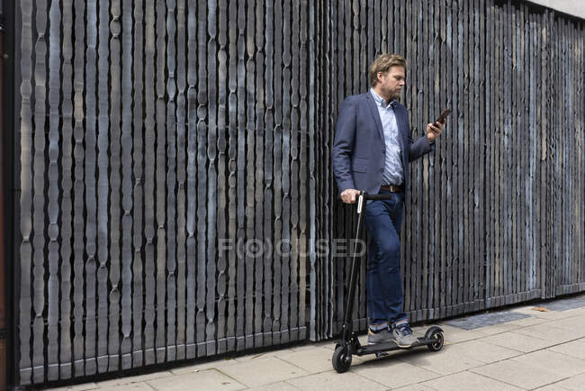 Hombre de negocios caminando sobre el pavimento contra el edificio de vidrio moderno - foto de stock