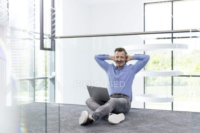Alto ángulo de adolescente femenina fresca en ropa amarilla con gafas de sol sentadas en el campo de deportes azul a la luz del sol - foto de stock