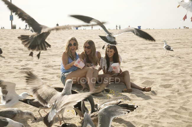 Grandmother and grandchildren with baskets giving grain to grazing hens while standing near barn on sunny day on farm — Stock Photo