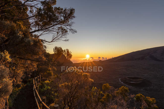 Sunrise at Bromo Tengger Semeru National Park in East Java, Indonesia taken with a drone. Low clouds visible around Mount Bromo crater. — Stock Photo