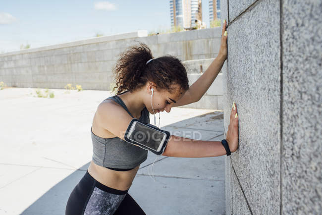 Fit female runner in sports bra with mp3 player armband and headphones resting in urban tunnel