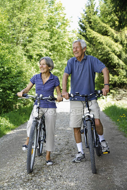 Senior couple smiling and looking in camera in residential building exterior. — Stock Photo