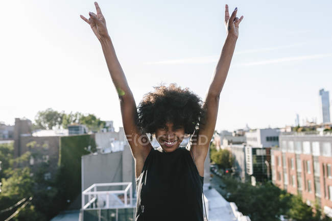 Happy businesswoman on sunny, urban balcony — Stock Photo