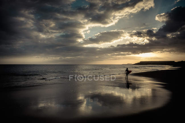 Woman standing on a beach at sunset during a storm, Canada — Stock Photo