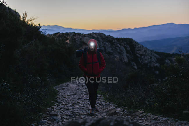 Anonymous traveler with torch contemplating lagoon among mountains under starry sky at sundown in Spain
