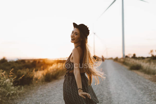 Man standing on road and looking at impressive evening sky — Stock Photo