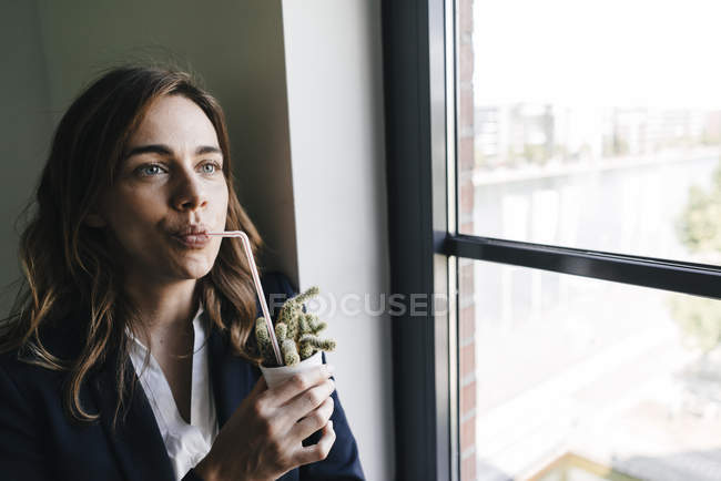 Портрет жінки в окулярах і білому капелюсі і зворушливому склі за вікном