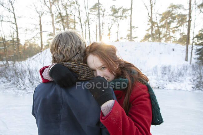 Вид збоку щасливий хлопець обіймає молоду леді в лижних куртках біля дерева, прикрашених освітленими казковими вогнями