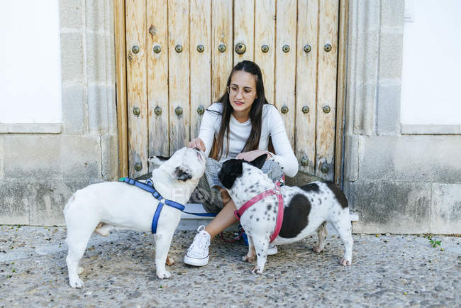 Впевнена жінка в модному літньому загальному стоячи біля старого покинутого каравана і дивлячись на камеру — стокове фото