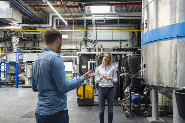 Два кавказьких і афро-американських чоловіки-фабрики, одягнені у жилет високого ґатунку з планшетом і дивляться на плани на дошку. Працівники на фабриці роблять гідравлічне обладнання.. — стокове фото