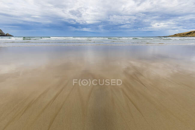 Піщаний пляж з хвилями і блакитним небом — стокове фото