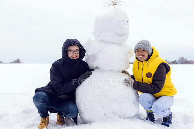 Друзі-чоловіки з розділеними дошками на сніжному полі проти гірського хребта під час відпустки