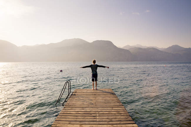 Вид ззаду анонімного чоловіка, що стоїть на порожній дорозі серед спокійної води і тягнеться до зірки під барвистим ближнім небом з молочним шляхом на фоні