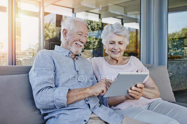 Портрет усміхненої старшої жінки, що спирається на диван вдома — стокове фото