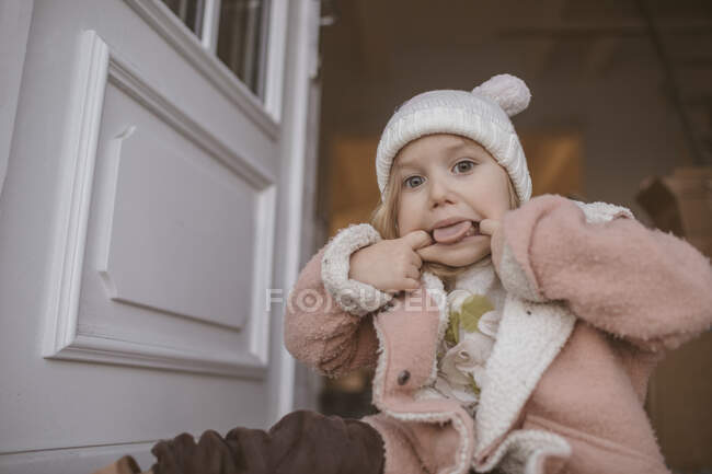 Бурхлива дівчинка сидить на сходах біля курки (Польща). — стокове фото